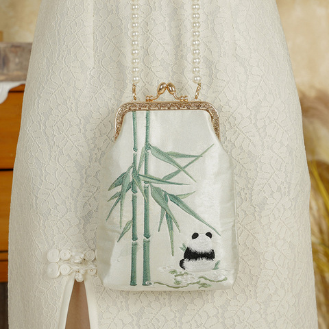 Bamboo Bear Accompanied Guofeng Light Color Series Embroidered Handbag Cheongsam Style Panda Mobile Phone Bag National Style