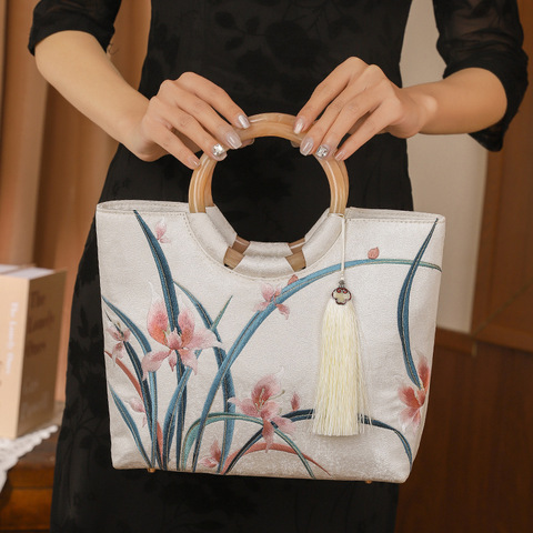 Tang serisi işlemeli çanta çin tarzı Cheongsam Hanfu Lotus işlemeli deri çanta ile Polyester astar